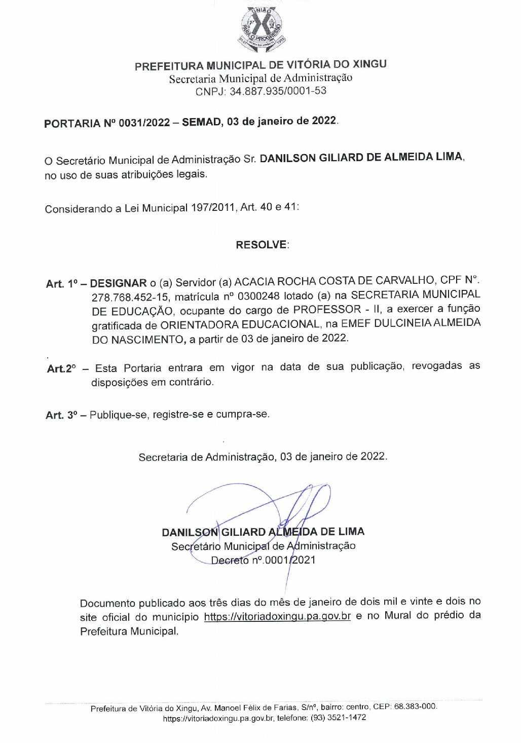 PORTARIA Nº0031-2022 ACACIA ROCHA COSTA DE CARVALHO