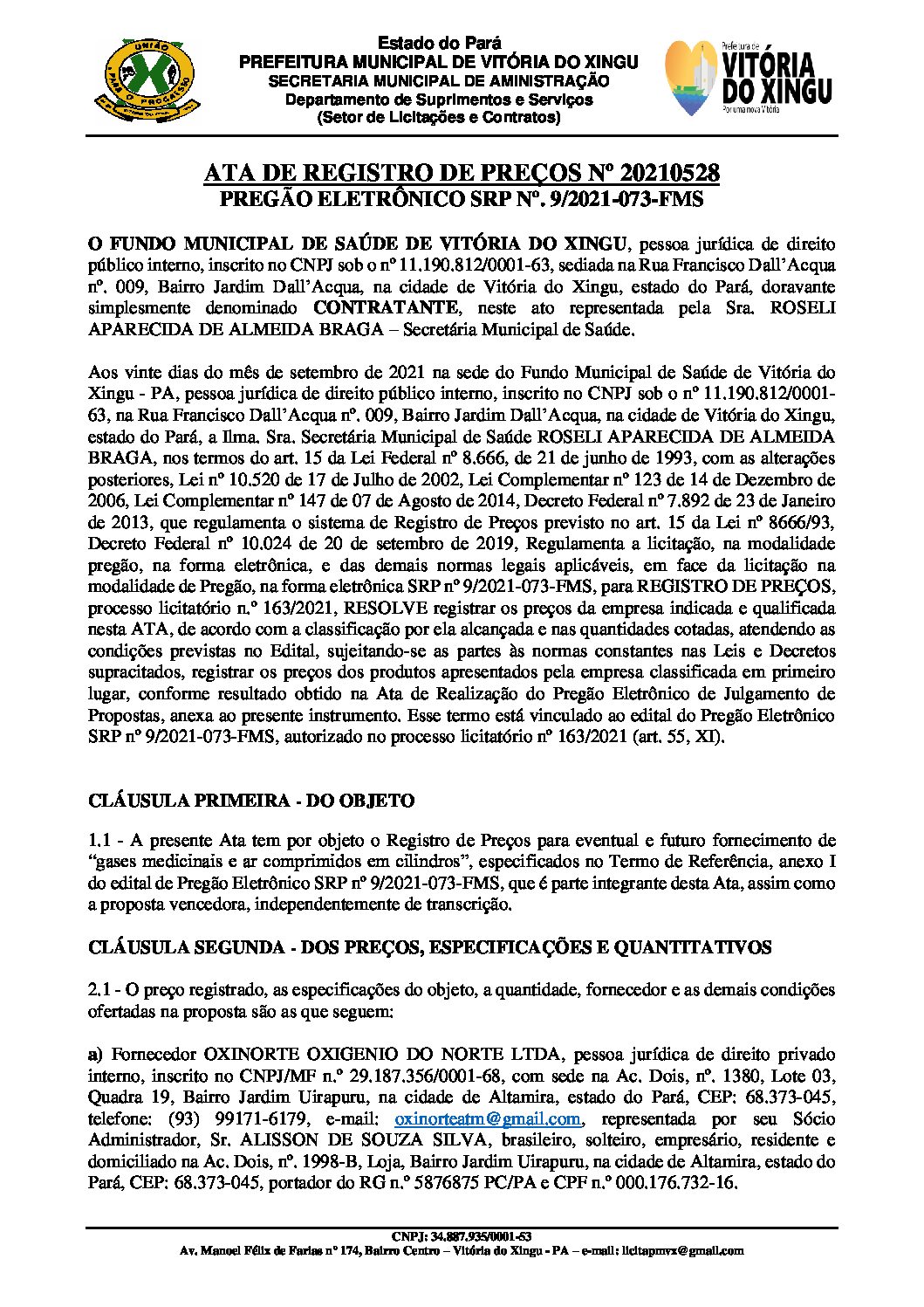 ATA PE – SRP – 9-2021-073-FMS – Oxigênio e Ar Comprimido – Ata de Registro de Preços nº 20210528 ASSINADO